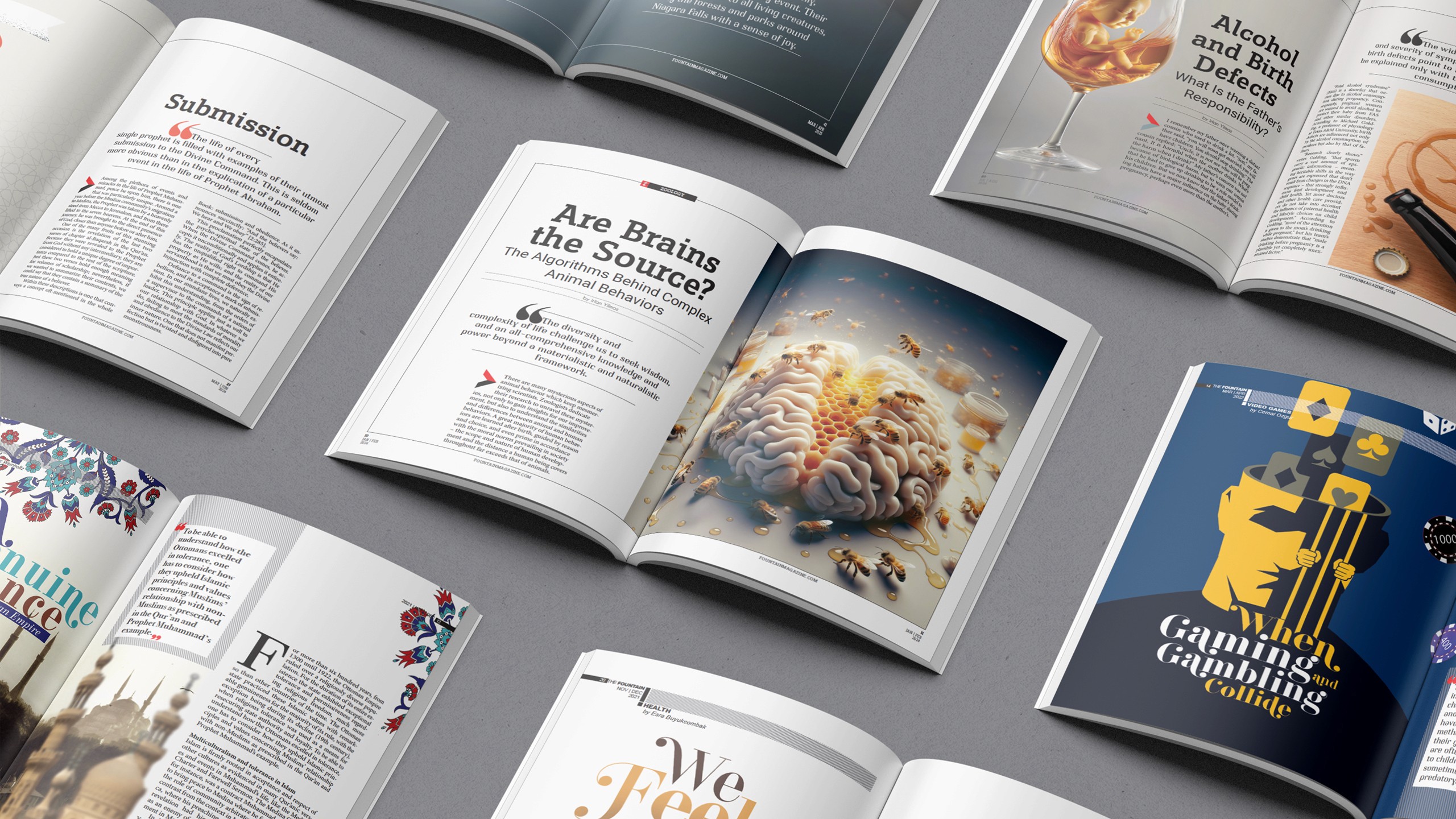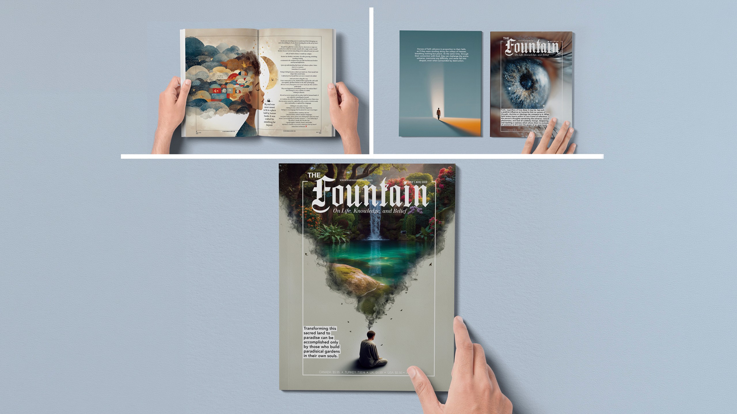 The Fountain Magazine (English), Revista Cascada (Spanish), Confluence Magazine (French), and Çağlayan (Turkish)… Designing for each of these publications required me to develop a unique philosophy that reflected different languages and lifestyles. For me, it was an invaluable experience—one that revealed how graphic design creates a universal language of its own. Though cultures and languages differ, I have witnessed how people unite under shared human values. This realization deepened both my sense of life’s meaning and my appreciation for the unifying power of design.